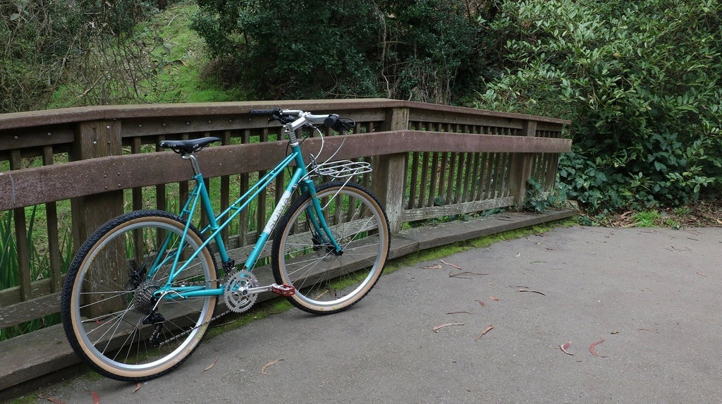 A true mixte frame with the double top tube/stays. Obviously offers lots of standover height and style as well. You’ll find the geometry is more sporty, than upright-comfy. Though it can be built up to suit either demeanor. Drop bars? Sure. Moustache bars? Of course.